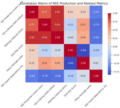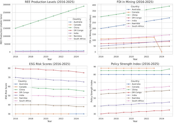 This paper provides a comprehensive assessment of the strategic positions of India, Australia, and select African nations (South Africa, Namibia, Democratic Republic of Congo, and Tanzania) within the global Rare Earth Elements (REE) supply chain and examines the geopolitical and economic significance of Rare Earth Elements (REEs) in the context of global supply chains, with a particular focus on the strategic vulnerabilities arising from China’s overwhelming dominance in extraction, processing, and manufacturing. By analyzing the roles of India, Australia, and select African nations, the study employs robust quantitative methodologies—including time series analysis, correlation matrices, panel regressions, and the Gravity Model—to assess production capacities, foreign direct investment (FDI), policy frameworks, and environmental, social, and governance (ESG) risks from 2016 to 2023. The findings reveal that China keeps over 90% control in REE processing and manufacturing, creating significant strategic risks for other nations dependent on these critical minerals for technological advancement and energy transition. The analysis proves that increasing domestic refining capacity, attracting FDI, and strengthening governance are essential for countries seeking economic resilience and strategic autonomy as far as rare minerals are concerned. Notably, the research finds strong positive correlations between FDI, refining capacity, and REE production, underscoring the importance of investment in value-added activities. Policy simulations, such as Difference-in-Differences and Impulse Response analyses, further illustrate how strategic policy interventions can meaningfully alter production trajectories and reduce dependency on single-source suppliers. The paper concludes with actionable policy recommendations, advocating for the diversification of supply sources, the development of comprehensive domestic value chains, and enhanced international cooperation through trade agreements and strategic alliances. These insights are vital for emerging and resource-rich nations aiming to mitigate dependency on China, strengthen technological sovereignty, and navigate the evolving geopolitics of critical minerals amid the global shift toward sustainable energy and innovation. Keywords: Rare Earth Elements, Geopolitics,